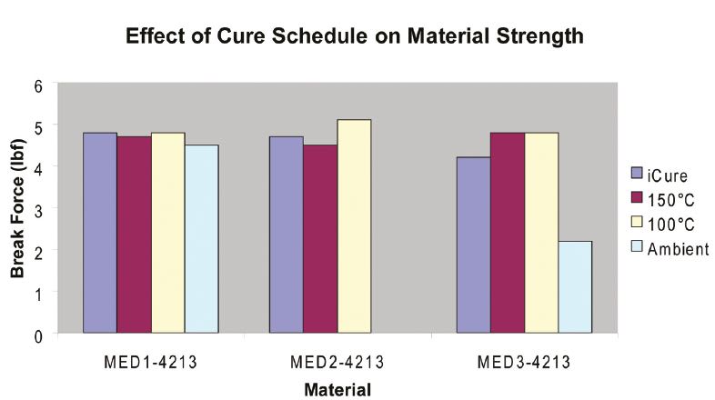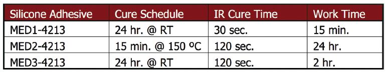 MED1-4213, MED2-4213 and MED3-4213 are two-part, addition-cure adhesives commonly used in the assembly of medical devices. According to their cure schedules, MED1-4213 and MED3-4213 fully cure in 24 hours at room temperature (RT), 25 ºC, and are often cured in shorter time periods when exposed to heat. MED2-4213 has a longer work time and requires heat to initiate curing.