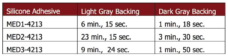 Per adhesive, Table 2 lists the average cure times of the samples based on the backing used. The wide discrepancy in cure times of samples of the same adhesives indicates that the substrate used will have significant influence over how much light is reflected back through the silicone versus how much is retained within the specimen. The increased absorbance of light and the subsequent radiation of heat can be seen in the decreased cure times of samples using the darker backing.