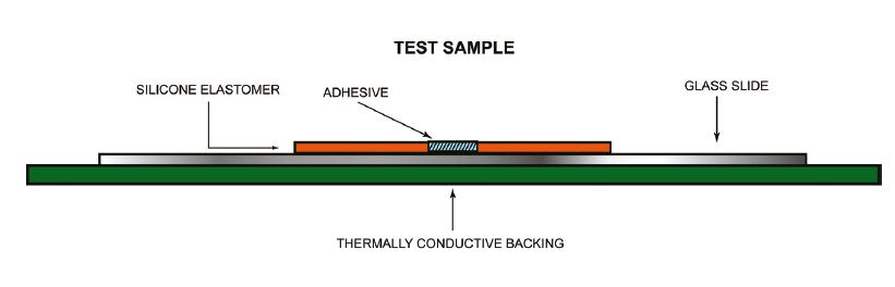 The silicone adhesives were cured on glass slides placed on one of two slightly different backings. Samples of each adhesive were divided between a thermally conductive alumina-filled silicone elastomer backing, and a darker gray version containing black pigment. Because the iCure system emanates light energy, or heat, to cure materials, the different colored backings presumably allowed for more extensive inter and intra adhesive cure time comparison. The samples were considered fully cured when they were completely solid and dry to the touch.