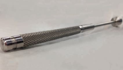 Thread rolling is a cold-working, or work-hardening, process in which hardened steel dies force the material of the blank work piece outward into the shape of the threads. Pictured in Figure 1 is a single thread roller. Unlike subtractive methods, rolling dies do not physically remove the material but instead displace it. This displacement provides physical qualities, such as tensile strength, fatigue resistance, and smooth surface finish that are highly desirable to device designers.